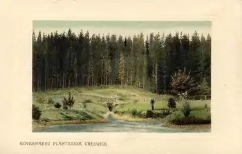 In 1887, John La Gerche established a small plantation in Sawpit Gully north of Creswick by enclosing a 2-acre plot and transplanting over 700 seedlings. La Gerche chose the Sawpit Gully site because he was advised that its slopes and soils were “the very thing for growing pines”. The location was highly disturbed by old gold diggings, but it had a water race snaking around the spurs.[7] He established a nursery in 1888. The owner, Albert Wade, prepared the land for planting and agreed to become caretaker.