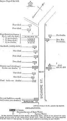 Lea's description of an outbreak of cholera in Cincinnati, Ohio in 1849,[3] presaged some of the techniques used later by John Snow in his famous investigation of the 1854 outbreak of cholera in London, England, including a detailed map of the residences of those struck with cholera in relation to their water supply. John Lea's proposed etiological mechanism, more closely aligned with the popular Miasma theory of his day, does not match our current understanding of the microbial nature of cholera; however, his recommended approach to limiting the spread of cholera (using rain water or boiled water) would have been an effective preventive.[4]