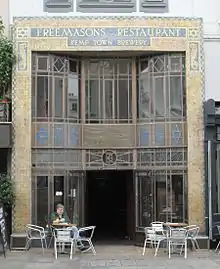 Denman's "famous facelift" of this mid 19th-century corner-site restaurant, a plain stuccoed Classical-style building, has been described as "spectacular",[77] "striking" and "reminiscent of the Viennese Secession". The three-bay exterior is framed by a two-storey gold and blue mosaic with gold lettering at the top. There is a dado with gold Masonic symbols, and there are Stars of David and chimera-like figures. Below the mosaic frame, a two-storey glazed bronze screen with metal framing leads to a recessed doorway. The inside is Art Deco in style.[78][79]