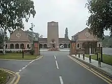 In February 1946, Denman was commissioned by the South West Middlesex Crematorium Joint Board (formed by councillors from several urban districts in Middlesex) to design a crematorium for a site at Hanworth in the district of Feltham. Building work did not start until 1952, though. There were two chapels with cloisters of unequal size flanking a tower with the hall of remembrance inside. Various other buildings were also provided on the site. It was dedicated in 1954.[59]