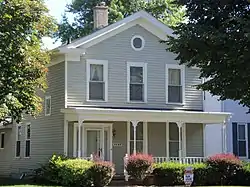 The house is an example of a popular form found in the city of Davenport: two-story, three–bay front gable, with an entrance off center and a small attic window below the roof peak.[3] This house has the suggestion of a classical pediment, which is accomplished by bringing the roof eaves and cornice partway across the front.[4] A small columned porch with a pediment completes the front. Another architectural element to the house is a bay window that is featured toward the back on the east side of the house.