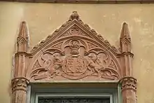 - 1859 Garthmyl Hall, Berriew, Montgomeryshire. Designs by J. K. Colling. Ornamental friezes and consoles. Coat of arms with foliage and roses.[27]