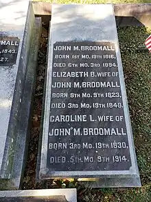 His wife Elizabeth died young and in 1852 Broomall was remarried to Caroline Larkin. Together they had an additional five children, three of whom lived to adulthood.[3]
