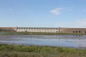 John Martin Dam is an earth-fill embankment dam that stands 118 feet (36 m) tall and 2.6 miles (4.2 km) long.[5][7] A portion of the dam's midsection is a concrete spillway controlled by 16 radial gates which empty into the Arkansas River.[5][18] When the reservoir is filled to its maximum capacity, the spillway has a discharge capacity of 660,000 cubic feet per second (19,000 m3/s). When the reservoir is filled to the top of its flood control pool, the river outlet has a capacity of 16,300 cubic feet per second (460 m3/s).[3]