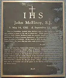 John McElroy SJ (14 May 1782 – 12 September 1877) was a Jesuit priest who founded Catholic schools in the United States. After emigrating to the United States in 1803, McElroy enrolled in Georgetown University in 1806, the same year in which he joined the Society of Jesus as a lay brother. His brother Anthony also became a Jesuit. McElroy assumed the management of Georgetown's financial affairs. He was ordained a priest in 1817. In 1822 he was sent to Frederick, Maryland, where he was to remain for 23 years as pastor of St. John the Evangelist Catholic Church in downtown Frederick. It was in Frederick that he founded St. John's Literary Institution. During the Mexican–American War, McElroy served as an Army chaplain, and on his return from Mexico he went to Boston, where he established Boston College and Boston College High School.