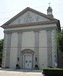 McElroy was ordained in May 1817, after less than two years of preparation.[2] As a new priest, he was assigned to Holy Trinity Catholic Church in Georgetown as an assistant pastor.[6] In his short time at Trinity, he contributed to the growth of the congregation and enlarged of the church building.[6] This was achieved by increasing the monthly subscription for congregation members from 12½ cents to $12.50 on 3 July 1819.[6] The following day he travelled to most of the congregation members' homes and collected $2000 in pledges. He immediately set to work having the Church modified to include 2 lateral-wing chapels, which were first used on 3 October 1819.[6]
