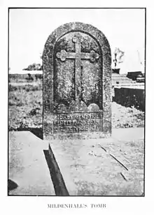 John Mildenhall is interred at the Roman Catholic cemetery in Agra. Originally his grave had a Portuguese inscription which read "Joa de Mendenal, Ingles, moreo aos [unintelligible text] Junho 1614" (literally: Englishman, dead in June 1614).[6] In the 20th century an English inscription was added, probably by the colonial English government:[7]