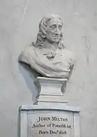 Milton died on 8 November 1674 and was buried in the church of St Giles-without-Cripplegate, Fore Street, London.[47] However, sources differ as to whether the cause of death was consumption or gout.[47][48] According to an early biographer, his funeral was attended by "his learned and great Friends in London, not without a friendly concourse of the Vulgar."[49] A monument was added in 1793, sculpted by John Bacon the Elder.
