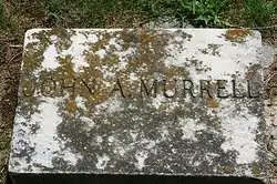 In a deathbed confession, Murrell admitted to being guilty of most of the crimes charged against him except murder, to which he claimed to be "guiltless".[6] John A. Murrell died on November 21, 1844, nine months after leaving prison. He was reported to have contracted "pulmonary consumption" (tuberculosis). Murrell was interred at Smyrna First United Methodist Church Cemetery, in Smyrna, Tennessee. After Murrell died, parts of him were dug up and stolen by grave robbers. Although the corpse had been half-eaten by scavenging hogs, the head was separated from the torso, pickled, and displayed at county fairs.[7] His skull is missing, but the Tennessee State Museum holds one of his thumbs.[8]