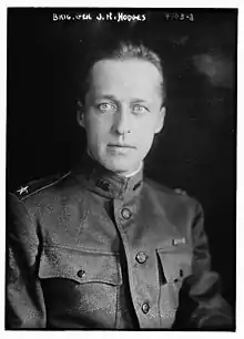 Hodges was commissioned into the United States Army Corps of Engineers. He commanded the Sixth Engineer Regiment during World War I, and he worked with the British to build bridges on the Somme. Hodges received the Distinguished Service Medal for his efforts,[2] and on June 26, 1918, he was promoted to the rank of brigadier general.[1]