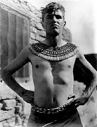 Pendlebury brought enthusiasm and colour to the excavation at Amarna, during which a handful of Europeans supervised up to 100 native workers. John had learned sufficient Arabic to get by from a textbook in 1928. Hilda learned practical Arabic from the servants. The living arrangements for the director and other Europeans were not entirely modest; however, Pendlebury was democratic in his bearing and manner, a policy on which he and Evans had been united. Just as Evans as a young reporter in the Balkans had purchased formal Turkish garb to wear at social occasions, Pendlebury purchased formal Cretan garb to wear on similar occasions at Amarna. In a photograph, however, he is shown shirtless posing wearing ancient Egyptian faience. He scowls, poking fun, perhaps, at ancient Egyptian statuary. He impressed the then British directors of Egyptian archaeology to such a degree that at the end of the first season he was offered a permanent post at the Cairo Museum. He turned it down, reporting privately that he did not wish "a stationary job".[19]