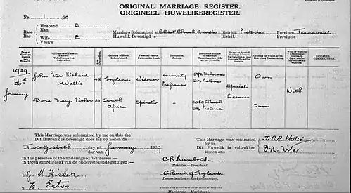 Wallis was married to Dora Mary Fisher, a 33-year-old spinster, on 26 January 1929 at Christ Church, Arcadia in Pretoria by the Dean of the Church of England in Pretoria, the Very Rev. C.R. Rumbold. Wallis was recorded as being a widower living at 892 Schoeman St, Pretoria.