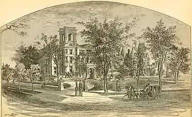 In 1864, Plankinton purchased the James H. Rogers mansion along with its surrounding seven acres that he turned into a parkland.[47] He spent $200,000 (equivalent to $3.1 million in 2022)[48] remodeling the house into the most elegant and expensive residence in Milwaukee.[49] The scale of the value of the property can be inferred from the $5,000 spent to add a carriage barn just after the mansion was completed, as at the time $750 was sufficient to build a country cottage and $7,000 was enough for a major stone-and-brick villa.[50]