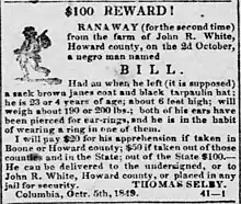 In 1849, Thomas Selby of Columbia, Missouri, placed a runaway slave ad describing a man named Bill, who had emancipated himself from White's farm (twice).[13] The nature of Selby and White's professional or personal relationship is unclear, but year prior, according to the 20th-century history Bench and Bar of Boone County, "In 1848, 'Lewis, a free person of color', was prosecuted for 'aiding and assisting in decoying Caroline, a slave, the property of Thomas Selby...Selby was proprietor of Selby's Hotel in Columbia, and Caroline waited on the hotel table. Lewis, who had been liberated by his former master, visited Caroline and told her of the benefits of freedom. So Lewis had to go to jail."[14][15] There was also a slave trader named William Selby working in the area.[1]