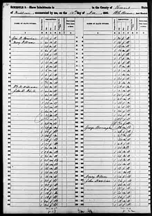 A runaway slave ad in Louisiana in 1860 sought to recover Sam, who had been purchased from Henry A. Castle who had bought him from Col. John R. White of St. Louis, Mo.[21] At the time of the 1860 U.S. census, White legally enslaved 76 people.[3] In 1864, following the Emancipation Proclamation and the establishment of the U.S. Colored Troops, "Seven of John R. White's slaves—William, Adam, Alfred, Sam, Andy, Preston, and Jacob—all enlisted together at the Fayette [County, Missouri] provost marshal post in the first weeks of January. White was one of Missouri's largest slaveholders; the seven who joined represented a mere tenth of White's holdings, though it signified collective action on the part of a portion of his slaves."[3]