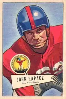 John Joseph Rapacz (April 25, 1924 – January 2, 1991) was an American football offensive lineman in the National Football League (NFL) for the New York Giants. He also played in the All-America Football Conference (AAFC) for the Chicago Rockets/Hornets. Rapacz played college football and baseball at the University of Oklahoma, where he was an All-American in football, and was drafted in the third round of the 1947 NFL Draft by the Boston Yanks.[1] After retiring from the NFL Rapacz went on to become a Michigan High School Hall of Fame football coach for Hackett Catholic Central High School.