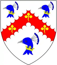 He was the son of Michael Ridgeway of Newton Abbot, Devon, a brewer,[2] the name of whose wife is not recorded. Vivian (1895) suggested he was the son of Stephen Ridgeway, Mayor of Exeter in 1491.[3] An alternative surname of "Peacock", to that of Ridgeway, was declared in 1564 by his descendant to the heralds at the Heraldic Visitation of Devon, but this name has not been found in other surviving records.[4] The ancient arms of "Ridgway" as recorded by Pole do however make a canting reference to this "alias": Argent, on a chevron engrailed gules three trefoils or between three peacock's heads erased azure crowns about their necks or.[5] The family's modern arms, which they bore in the time of Pole (d.1635), were recorded by the latter as: Sable, two angel's wings conjoined tips upwards argent. These arms are displayed on the Ridgeway monument in Tor Mohun Church, and are a differenced version the arms of Barnehowse, whose co-heiress was Mary Southcott, the wife of Sir Thomas Ridgeway, son of John: Gules, two wings conjoined in lure argent.[6]