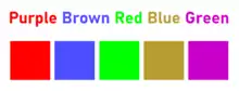 Stroop's research into what became known as the Stroop effect showed that it takes more time to name the color of a word where the word does not correspond to that color (conflict), than to name the color of a square (no conflict).