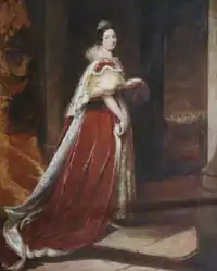 Coronation of Queen Victoria by John Martin, 1839 The painting depicts the accident of Lord Rolle falling on the steps of the Throne