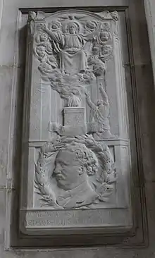Lady Stainer was devastated by his death and went into mourning for a year, but as she confided to a friend, the pianist Francesco Berger, "I am thankful he has been spared long illness and the weariness of old age, which he always dreaded".[31] She gave a memorial stained glass window to St Cross Church and arranged for a monument to be erected at Magdalen College. Her husband's valuable library of antiquarian music books passed to his elder son, J F R Stainer, who allowed its use for study and research purposes. The collection was sold to an American collector in 1932 who, on his death in 1973, had it bequeathed to the Bodleian Library, where it remains. Lady Stainer died in 1916 leaving six children. She is buried in Holywell Cemetery, Oxford, beside her husband.[31]