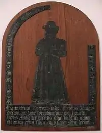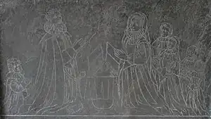 - Nathaniel (1579–1626), baptised at Hadleigh in 1579, died 1626 at Hutton, Somerset. Nathaniel married Jane Whitmore (died 1639, buried at Bath Abbey), a daughter of William Whitmore (died 1593), a haberdasher of Balmes Manor, Hackney[6] and of Apley Hall, Shropshire. Jane's nephew was Sir Thomas Whitmore, 1st Baronet (1612–1653).[7] They had a son who died young, and five daughters and co-heiresses: (1) Anne, born 1613, married to John Codrington of Codrington and Didmarton, Glos., to whose family passed the manor of Hutton, (2) Jane (born 1614) married Sir James Pyle of Compton Beauchamp, Berks, (3) Elizabeth (born 1618), living in 1639, (4) a fourth daughter unnamed; (5) Mary (born c. 1620) married to John Dennis (died 1660) of Pucklechurch, Glos., Sheriff of Gloucestershire and son of Henry Dennis (died 1638), who had married as his second wife Nathaniel's widow Jane. There is an incised stone mural tablet in a baroque surround in Hutton Church showing Nathaniel and his wife and children kneeling in prayer.