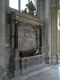 Wells Cathedral has a large canopied tomb with a recumbent effigy of the Bishop, situated against the east wall of the chapel between the north aisle and the Chapter House. It was repainted in the 19th century. It bears a Latin inscription:[9]