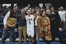 He was one of 74 college players invited to the spring tryouts for the 1984 U.S. Olympic team and coached by Bob Knight.[16][17] Stockton made the initial cut in April to the final 20, but was one of four released in May (with Charles Barkley, Terry Porter, and Maurice Martin) in the penultimate cut to 16 players.[18][19] Though not selected, the experience led him to meet his future teammate and friend, Karl Malone.[20]