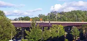 The John T. Loughran Bridge carries U.S. Route 9W (US 9W) over Rondout Creek between Kingston and Port Ewen, New York, United States. It also crosses over Ferry Street on the Kingston side. It is located just downriver from the historic Kingston-Port Ewen Suspension Bridge, which carried 9W until the Loughran Bridge was constructed. It is just upriver from where the Rondout empties into the Hudson River.