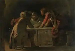 Tenniel's first book illustration was for Samuel Carter Hall's The Book of British Ballads, in 1842.[15] While engaged with his first book illustrations, various contests were taking place in London, as a way in which the government could combat the growing Germanic Nazarenes style and promote a truly national English school of art. Tenniel planned to enter the 1845 House of Lords competition amongst artists to win the opportunity to design the mural decoration of the new Palace of Westminster.[16] Despite missing the deadline, he submitted a 16-foot (4.9 m) cartoon, An Allegory of Justice, to a competition for designs for the mural decoration of the new Palace of Westminster. For this he received a £200 premium and a commission to paint a fresco in the Upper Waiting Hall (or Hall of Poets) in the House of Lords.[9]
