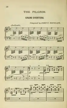 Douglass's The Pilgrim: Grand Overture for piano was published by the Lee & Shepard firm in 1878 for Trotter's study.[11] According to Trotter, Douglass wrote the piece in his twenties (1867–1876).[11] The piece is 173 bars, in the key of E minor and marked Andante initially, but has many tempo changes throughout: Andante, Allegro Vivace, Adagio, Allegro, Lento and Allegro.[19] The regular use of scales, tremolos and embellishments evokes the sense of a piano transcription from an orchestral score.[10]