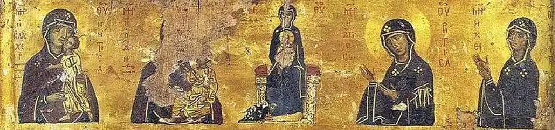 John's every calendar icon is divided in nine horizontal stripes, each of them usually displaying ten small scenes on the tetraptych. Each icon depicts the lives of three months of the year and represents all martyrs at the instant of their cruel death, while the other saints are depicted frontally, standing full-size. Each saint is accompanied with a caption bearing their name and specifying either their martyrdom or peaceful death. John's icon of the Last Judgement is now damaged, but its constituent motifs may still be determined.[20] The reverse of all six icons has a Greek epigram written in dodecasyllable[21] meter style,[22] while individual figures, compositions on the menologium and the Last Judgment panels, have bilingual Georgian-Greek inscriptions.[23][24] Georgian is written with medieval monastic[25] Nuskhuri script,[26] characteristic of the eleventh century.[27] The icon includes the Blachernitissa, representing the Virgin with the caressing standing Child, and Hodegetria which was a palladium of the Byzantine capital. All inscriptions reveal that John was also the donor of the icons.[28][29] John, with his complex panel wanted to explicitly demonstrate that, together with Christian dogmas and theological ideas, the icons manifest the identities of people.[30] Some of the images created by John are similar to the depictions from the Timotesubani monastery.[31] Some of his figures are depicted wearing turbans[lower-alpha 2] in hell.[34] He used sophisticated and poetic words on his icons.[35] It's been suggested that John might have painted Crucifixion of Jesus, which is missing from his Passion of Jesus icon.[36]