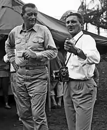 American actor, director, and producer John Wayne (1907–1979) began working on films as an extra, prop man and stuntman, mainly for the Fox Film Corporation. He frequently worked in minor roles with director John Ford and when Raoul Walsh suggested him for the lead in The Big Trail (1930), an epic Western shot in an early widescreen process called Fox Grandeur, Ford vouched for him.[lower-alpha 1] Wayne's early period as a star would be brief, as Fox dropped him after only three leads. He then appeared in a string of low-budget action films (mostly Westerns) before garnering more recognition with the 1939 film Stagecoach.