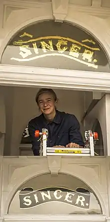 The work of the foundry can be seen in several different locations. The Frome Museum has window balustrades and metal banister supports on the interior cantilever or torsion staircase of 1865–9. His house at 25 Market Place has window balustrades on the first floor. In 2019 the original sign above the door lintel was re-gilded, funded by the Frome Society for Local Study. The Church of St John the Baptist has a brass screen to the chancel and a forged metal one to the Lady Chapel.[64] There is a brass lectern and brass candlesticks in the church, but it is uncertain that these are Singer products; he did make such items for the church, but there has been some clearance of excess Victorian items. The Holy Trinity Church has a rood screen installed in 1903–06, now repositioned in a chapel to one side.[65] New gates for the Blue House were provided by the Singer company in 1994 in response to an appeal by the trustees; a plaque is placed on the wall to the left of the entrance.[66]