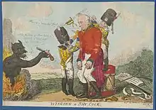 A cartoon showing Whitelocke's demotion after the court martial. Two child drummers strip him of his military garb and break his sword as a devil offers him a weapon to commit suicide. - This article incorporates text from a publication now in the public domain: Chisholm, Hugh, ed. (1911). "Whitelocke, Sir James". Encyclopædia Britannica. Vol. 28 (11th ed.). Cambridge University Press.