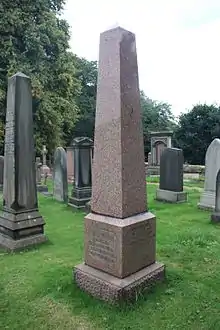 He was buried on the southern side of Dean Cemetery on 7 April. A large red granite obelisk was erected at his grave.