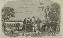 The first successful religious colonization of the New World occurred in 1620 with the establishment of the Plymouth Colony on the shores of Cape Cod Bay.[40] Pastor John White led a short-lived effort to establish a colony at Cape Ann in 1624, also on the Massachusetts coast.[41] In 1628, some of the investors in that effort joined with new investors to acquire a land grant for the territory roughly between the Charles and Merrimack Rivers. It was first styled the New England Company, then renamed the Massachusetts Bay Company in 1629 after it acquired a royal charter granting it permission to govern the territory.[42] Shortly after acquiring the land grant in 1628, it sent a small group of settlers led by John Endecott to prepare the way for further migration.[43] John Winthrop was apparently not involved in any of these early activities, which primarily involved individuals from Lincolnshire; however, he was probably aware of the company's activities and plans by early 1629. The exact connection is uncertain by which he became involved with the company because there were many indirect connections between him and individuals associated with the company.[44] Winthrop was also aware of attempts to colonize other places; his son Henry became involved in efforts to settle Barbados in 1626, which Winthrop financially supported for a time.[45]