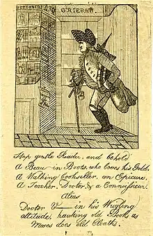 Drawing of an elderly man in old-fashioned clothing walking in profile to the left. Under his right arm is a large umbrella, and in his left hand is a tall cane with which he walks. From his coat pocket project two books, one reads 'French' and the other 'Italian German Dutch &c'.