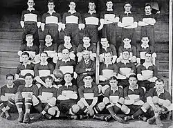 The next game, away to Scotland on 2 February, resulted in defeat for Wales, with the seven forwards system receiving much of the blame. The Williams–Gabe combination performed well on the left wing, but the Welshmen were unable to cross their opponents' line.[17] Against Ireland at Cardiff Arms Park on 9 March, Wales fielded a team including eight Cardiffians. Gabe was appointed captain for the match, while Billy Trew - the former captain - and Dicky Jones, were replaced at halfback by Percy Bush, Cardiff's captain, and Dicky David, also from Cardiff and earning his first - and only[18] - cap for Wales.[19][20] Wales beat Ireland 29–0, and 26 of the points came from Cardiff players.[21] In the first four minutes of the game, the Welshmen reached the Irish 25. Following a scrum, the ball reached Gabe, and he, after making some ground, passed to Williams, who ran in a try unopposed. Early in the second half, with Wales leading by two tries to nil, a lineout to Wales on the Irish 25, resulted in Williams receiving the ball and, after breaking through the Irish defence, with only Hinton, the fullback, to beat, passed to Gabe to score the try. Williams scored a second try after David, receiving the ball from the forwards, passed to Bush, who got past the Irish halfbacks, and passed to Gabe, missing out Evans. Gabe then ran up to Hinton, and passed the ball to Williams to score. A third try came for Williams in similar style, and he came close to scoring a fourth.[22] The David–Bush halfback pairing, and the Gabe–Williams partnership on the left wing, supported by the excellent play of Winfield at fullback, and that of the forwards, were the decisive factors in the Welsh triumph over Ireland.[23]