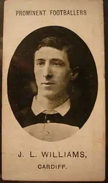 Having played association football at school, Williams switched to playing rugby with the Whitchurch Village rugby club.[5] From the start of his career, he played on the left wing.[6] In 1899, Williams was invited to play at Newport RFC under the newly appointed captain, Llewellyn Lloyd. Several players had departed, leaving gaps in the backline, and Williams was brought in, alongside Cliff Pritchard and W. Isaacs, while the effective pairing of Lloyd and Lou Phillips at halfback continued. In Williams' first season at Newport, the team scored a total of 416 points compared with the previous season's 192.[7] The following season was Newport's third best on record. However, Williams was injured during the course of the year. Nevertheless, his contributions were noted: against Moseley, despite an early error, he scored a try in the first quarter "after a grand run", and at the beginning of the second half, managed to touch down a second try, just before Yates "grassed him".[8]
