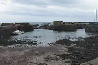 By 1847 the natural inlet near the village had been protected by "high water rocks" deposited to offer protection[6] Not until 1871 was the first harbour created: the enclosed area now to the north side. This was adapted in 1884 creating a breach in the southern breakwater to create an inner harbour, and only this double barrier offered Johnshaven protection from the harsh North Sea too which it is highly exposed. Due to multiple rocks flanking the harbour entrance, the harbour is frequently hazardous in bad weather.[7]
