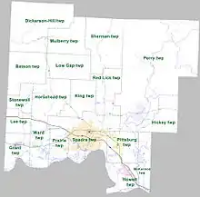 Townships in Arkansas are the divisions of a county. Each township includes unincorporated areas; some may have incorporated cities or towns within part of their boundaries. Arkansas townships have limited purposes in modern times. However, the United States census does list Arkansas population based on townships (sometimes referred to as "county subdivisions" or "minor civil divisions"). Townships are also of value for historical purposes in terms of genealogical research. Each town or city is within one or more townships in an Arkansas county based on census maps and publications. The townships of Johnson County are listed below; listed in parentheses are the cities, towns, and/or census-designated places that are fully or partially inside the township. [15][16]