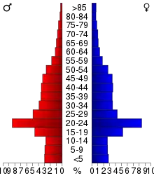 Age spread: 20.10% under the age of 18, 23.40% from 18 to 24, 30.80% from 25 to 44, 18.20% from 45 to 64, and 7.40% who were 65 years of age or older. The median age was 28 years. For every 100 females, there were 99.10 males. For every 100 females age 18 and over, there were 97.30 males.