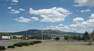 Johnson Mesa is a high plateau with a top-of-the-world atmosphere looking out over the Great Plains far below. New Mexico Highway 72 traverses the mesa east to west, part of the Dry Cimarron State Scenic & Historic Byway.[2] Several volcanic cones, including Red Mountain, Towndrow Peak, and Dale Mountain rise about 400 feet (122 m) above the mostly flat and treeless terrain. The cliffs surrounding the mesa are wooded with pinyon, juniper, Gambel oak and ponderosa pine, but the top is grassland. The source of the Dry Cimarron River is on the Mesa, but, before the coming of settlers, the only water sources were depressions in which water collected after rains. Several shallow lakes and ponds, including Berry and Bellisle lakes, have been created as watering holes for cattle. Below the south rim of Johnson Mesa is Johnson Park, about 3 miles (5 km) by 2 miles (3 km), at an elevation of 6,800 feet (2,073 m). The earliest access to the Mesa was through the Park.