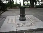 Interred under his monument in the square is Revolutionary War hero General Nathanael Greene, the namesake of nearby Greene Square. Greene died in 1786 and was buried in Savannah's Colonial Park Cemetery. His son was buried beside him after drowning in the Savannah River in 1793. Following vandalism of the cemetery by occupying Union forces during the Civil War the location of Greene's burial was lost. After the remains were re-identified Greene and his son were moved to Johnson Square. An obelisk in the center of the square now serves as a memorial to General Greene. The cornerstone of the monument was laid by Gilbert du Motier, Marquis de Lafayette, in 1825. At that time the obelisk did not yet commemorate any specific individual or event. In fact, due to financial restrictions the unmarked obelisk served for several years as a joint monument to both Greene and Casimir Pulaski. Inscriptions honoring Greene were added in 1886, but the Greenes’ physical remains did not arrive until 1901, following their "rediscovery."[4][2][5]