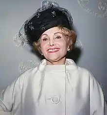 Gabor arrived in the United States on December 30, 1945, aged 49.[6][37][38] She opened a successful costume jewelry business (called simply Jolie Gabor) in New York City in 1946, with $7,200 borrowed from her daughters.[27][39][40] It later moved to 699 Madison Avenue.[41] Gabor also established a branch of the firm in Palm Springs, California. Among the company's designers were Elsa Beck and Stephen Kelen d'Oxylion, as well as her own daughter, Magda.[6][42] One of the saleswomen was Evangelia Callas, mother of future opera diva Maria Callas.[43] In 1953 the store introduced ornamental metal fingernails studded with rhinestones.[44]