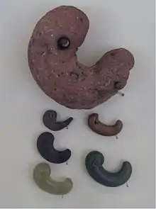 There is evidence that the Jōmon people built ships out of large trees and used them for fishing and traveling; however, there is no agreement as to whether they used sails or paddles.[26] The Jōmon people also used obsidian, jade and different kinds of wood.[27] The Jōmon people created many jewelry and ornamental items; for instance, magatama were likely invented by one of the Jōmon tribes, and are commonly found throughout Japan and less in Northeast Asia.[25]