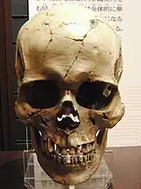 Male skull of the late Jōmon period (replica). Excavated at Miyano Kaizuka (Iwate Prefecture). Exhibition in National Museum of Nature and Science.[8]