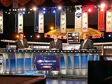 In May 2009, Gruden was hired by ESPN to serve as a color analyst on its Monday Night Football telecasts, replacing Tony Kornheiser.[96] He also served as an analyst for ESPN's coverage of the NFL Draft and postseason college football games, helping to call the 2010 Rose Bowl and 2010 BCS National Championship Game on ESPN Radio and the 2011 Outback Bowl and 2011 Orange Bowl on ESPN. In the spring of 2012, Gruden became the focus of the series Jon Gruden's QB Camp, where he went over the NFL development process with prospective NFL Draftees at quarterback, including Andrew Luck and Robert Griffin III. During the Monday Night Football broadcast, Gruden gave out a weekly award called the "Gruden Grinder" to the best player in the game that week.[97]