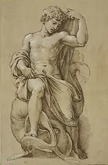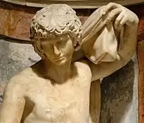 The head of Jonah was first identified as an Antinous by the art historian Giovanni Pietro Bellori in 1695.[5] It is unsure that Raphael and his circle identified the features as Antinous or they simply copied a beautiful antique head for the purpose of showing the youthful Jonah. In the middle of the 16th century there were at least 12 statues of Antinous in Roman collections but we have no certain information about the whereabouts of the Antinous Farnese in the 1510s.[6]