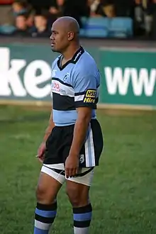 Lomu returned to professional rugby in 2005. He first needed special clearance from the World Anti-Doping Agency, as one of the anti-rejection drugs he was required to take is on the WADA list of banned substances.[77] On 8 April 2005, he signed a two-year contract to play for the New Zealand first division provincial team North Harbour in the NPC.[78] He ended up missing the first season when he injured his shoulder scoring a try in a preseason testimonial match against Martin Johnson's invitational XV.[79] Instead he worked in a coaching capacity.[80] North Harbour gave him permission to play overseas at the Cardiff Blues over the off season.[81]
